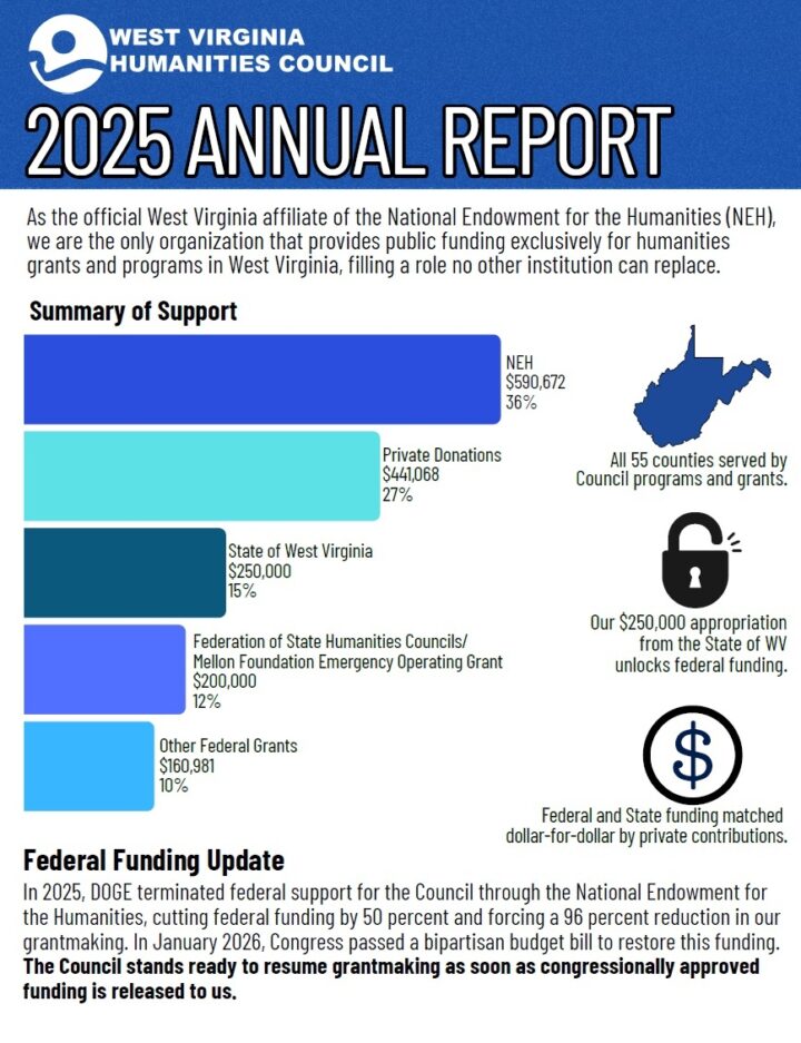 The Humanities Council is supported by the National Endowment for the Humanities, the West Virginia Department of Tourism, corporations, foundations, and many other organizations and individual donors – people like you!